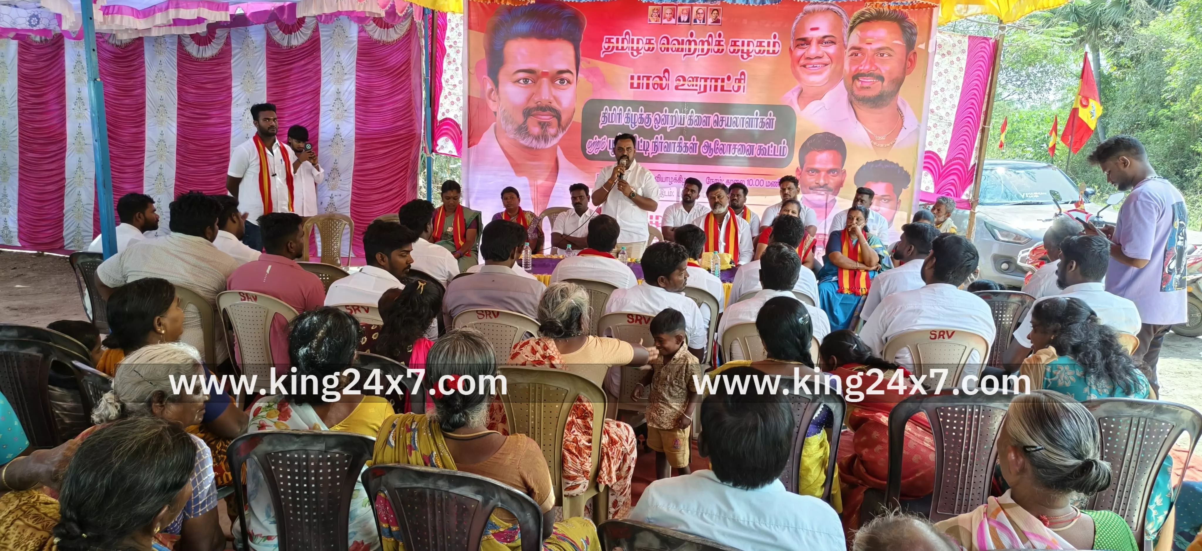 திமுகவின் ஓட்டு திருட்டை தடுக்க தவெகவின் பூத் கமிட்டி பொறுப்பாளர்கள் கண்காணிக்க வேண்டும் - மாவட்ட செயலாளர் பேச்சு.. இராணிப்பேட்டை மாவட்டம், கலவை அருகே உள்ள பாலி கிராமத்தில் தமிழக வெற்றி கழகத்தின் திமிரி கிழக்கு ஒன்றியத்தின் பூத் கமிட்டி பொறுப்பாளர்கள் மற்றும் கிளைக் கழக செயலாளர்களின் ஆலோசனைக் கூட்டம் திமிரி ஒன்றிய கழக செயலாளர் சிவகுமார் தலைமையில் நடைபெற்றது. இந்நிகழ்ச்சிக்கு ஒன்றிய பொருளாளர் பாலி சீனுவாசன், சரவணன், விகேஷ்வரன் கோவிந்தராஜ், ராஜ்குமார் ஆகியோர் முன்னிலை வகித்தனர். இந்த நிகழ்ச்சிக்கு சிறப்பு அழைப்பாளராக கலந்துக் கொண்ட ராணிப்பேட்டை மேற்கு மாவட்ட செயலாளர் விஜய்மோகன் பேசியதாவது, வருகின்ற 2026 சட்டமன்றத் தேர்தல் தமிழக வெற்றி கழகத்தின் வெற்றிகளம் ஆகும். ஆகவே ஒவ்வொரு பூத்து கமிட்டி பொறுப்பாளர்கள் மற்றும் கிளை செயலாளர்களும் தேர்தலுக்கான வேலையை செய்வதோடு திருட்டு திமுக அரசின் திருட்டு ஓட்டு தில்லு முல்லை கண்காணிக்க வேண்டும். அதேபோல் தற்பொழுது உள்ள திமுக ஆட்சியில் எங்கு திரும்பினாலும் கொலை, கொள்ளை, பாலியல் வன்கொடுமை, கஞ்சா பயன்பாடுகள் தான் உள்ளது. எனவே இந்த திமுக அரசை ஒழித்தால் மட்டுமே தமிழ்நாடு காப்பாற்ற முடியும் அமைதியான மாநிலமாக மாறும் மேலும் தலைவர் யாரை இந்த தொகுதியில் கைகாட்டி நிற்க வைக்கிறார்களோ அவரை பெறுவாரியான வாக்கு வித்தியாசத்தில் வெற்றி பெற செய்ய வேண்டும் என கேட்டுக்கொண்டார். அதனைத் தொடர்ந்து தமிழக வெற்றி கழகத்திற்கு ஒதுக்கப்பட்ட பிகில் சின்னத்தை குழந்தைகளுக்கு வழங்கி அனைவரும் பிகில் சின்னத்தில் ஓட்டு போடுமாறு கேட்டுக் கொண்டார். இந்த நிகழ்ச்சியில், மாவட்ட பொருளாளர் சுரேஷ், மாவட்ட இணை செயலாளர் காந்திபிரசாத் உட்பட மகளிர் அணியினர், தொண்டர்கள் என பலர் கலந்து கொண்டனர்.