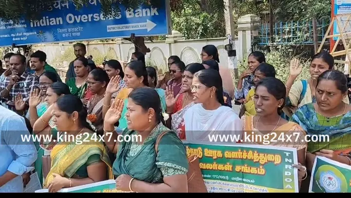 கரூரில்,தமிழ்நாடு ஊரக வளர்ச்சித்துறை சார்பில் 18 அம்ச கோரிக்கைகளை வலியுறுத்தி சங்கத்தின் மாவட்ட தலைவர் கிருஷ்ணமூர்த்தி தலைமையில் கண்டன ஆர்ப்பாட்டம் நடைபெற்றது.